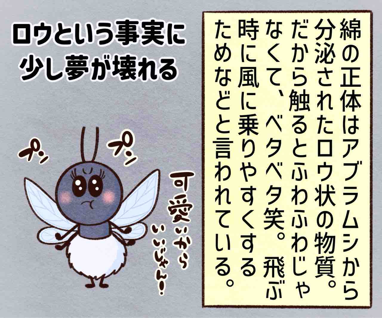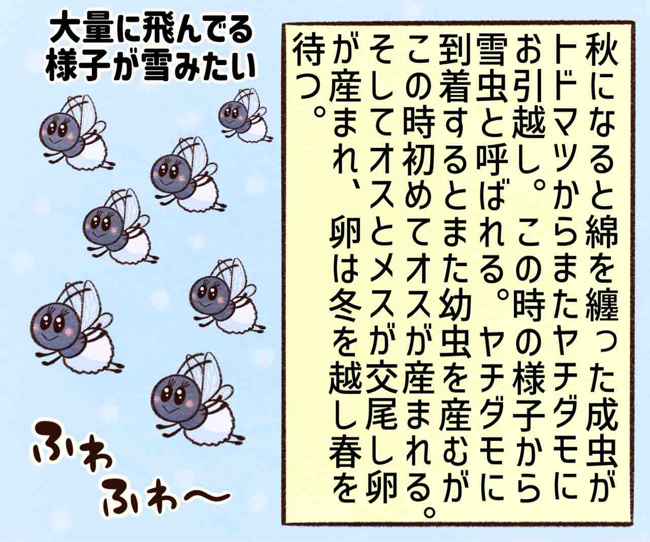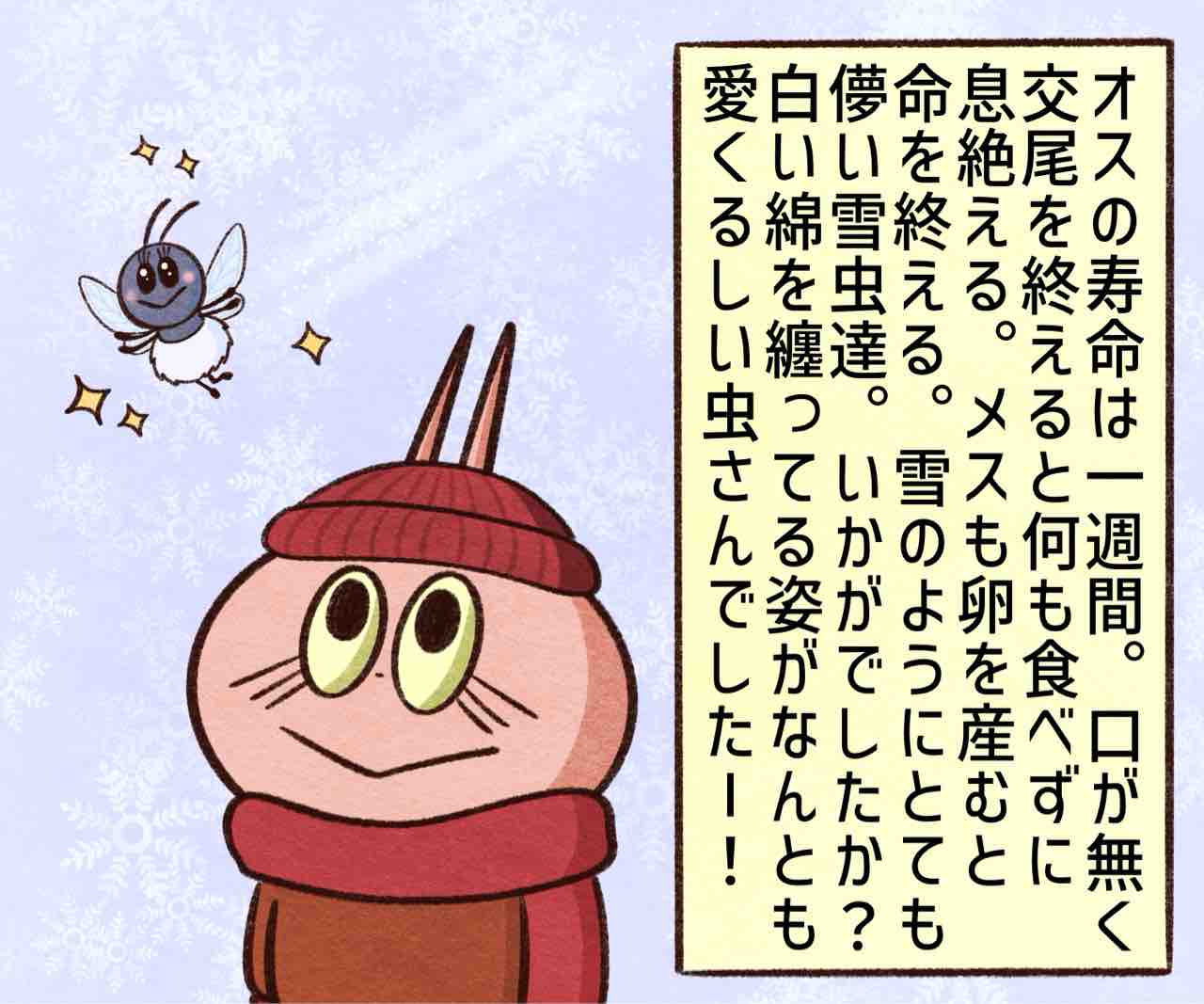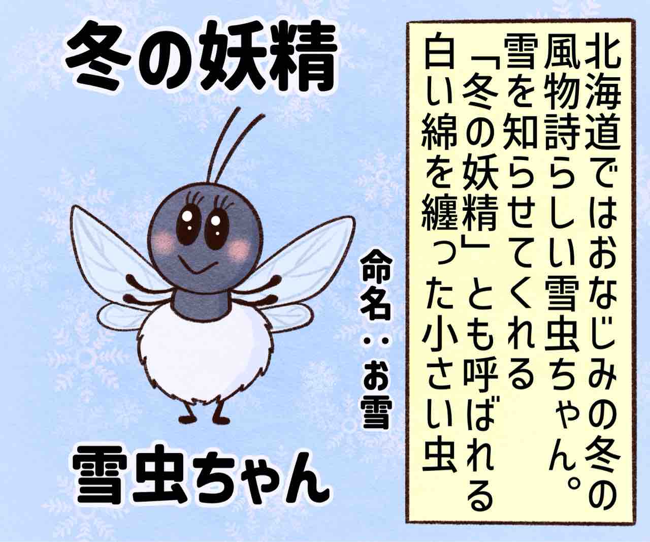 2026年01月13日 雪虫が可愛い ブログネタ:【公式】冬の好きなところ に参加中! 実は夏に引っ越しをするときも綿を纏ってるらしいが数があまり多くないからか人に気付かれてないっぽい。なんか綿の正体がアブラムシのロウ状のベタベタな分泌物って知って萎えたがまぁビジュが可愛いので無視w雪虫って初めて知ったけど本州にはいないっぽいね。毒もないし人には害は無いってさ〜ただ大量発生すると不快らしい笑まぁそうよね😩雪虫の新キャラお雪ちゃん。これから出てくるかもしれないし出てこないかもしれないけど雪虫気に入ったかまちょのLINEスタンプ販売中❤️‼️アプリでフォローしてね‼️ フォローしてくれたら泣いて喜びます クリックして投票してくれたら かまちょも喜びます❤️ 絵日記ランキング にほんブログ村かまちょの写真をアップしたりくだらないことを呟いてるよ🎶ブログには載せていないイラストもアップしてるよ✨