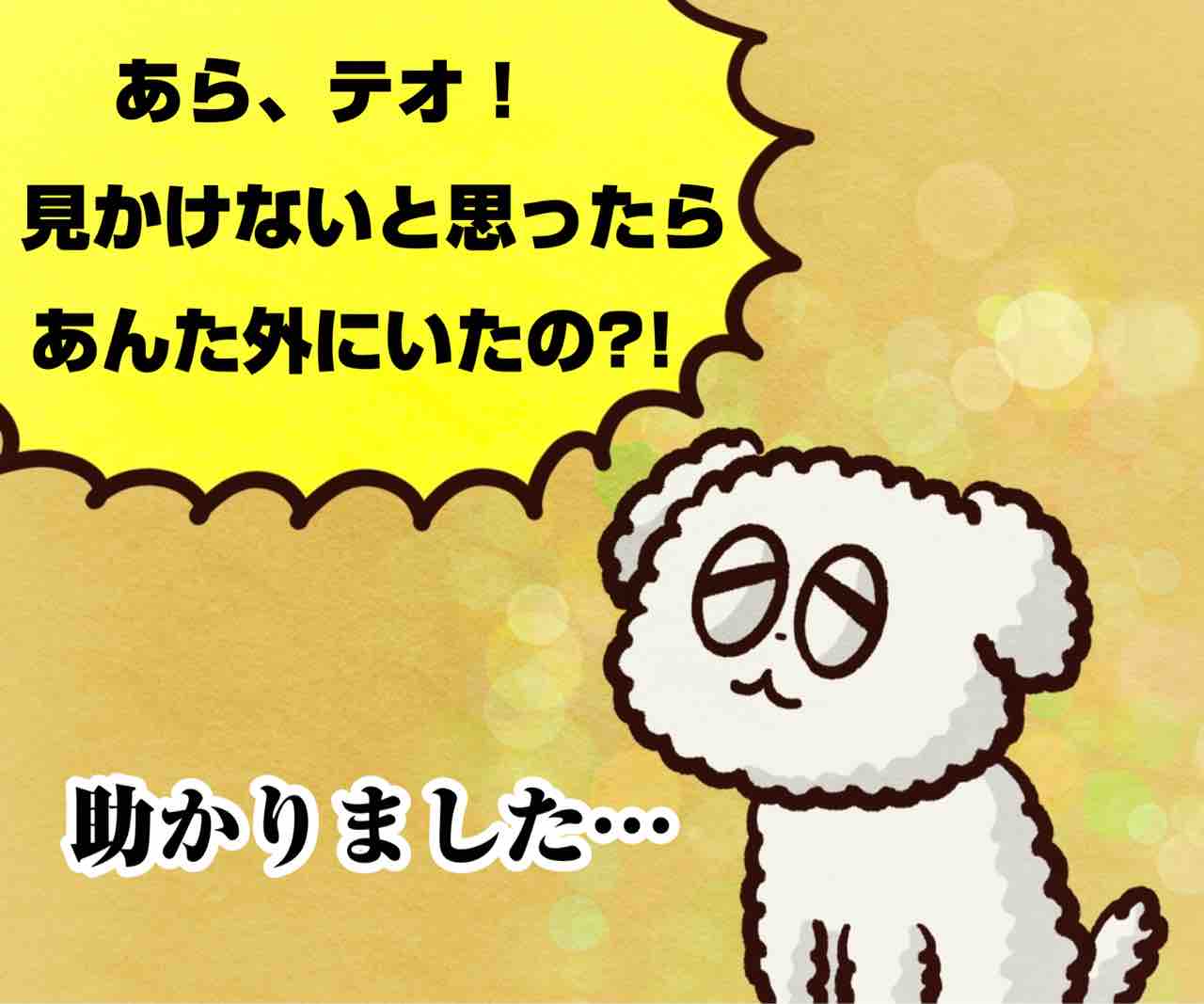 2024年10月11日 お困り犬、テオ ブログネタ:【公式】お出かけ中に起きた出来事 に参加中! このおばさん他に犬2匹飼ってて散歩帰りの玄関のわちゃわちゃでテオは家に入るタイミングを逃し、そのまま気付かれなかったっぽい笑テオの気不味そうな困り顔がなんか笑えた。かまちょのLINEスタンプ販売中❤️‼️アプリでフォローしてね‼️ フォローしてくれたら泣いて喜びます クリックして投票してくれたら かまちょも喜びます❤️ 絵日記ランキング にほんブログ村かまちょの写真をアップしたりくだらないことを呟いてるよ🎶ブログには載せていないイラストもアップしてるよ✨