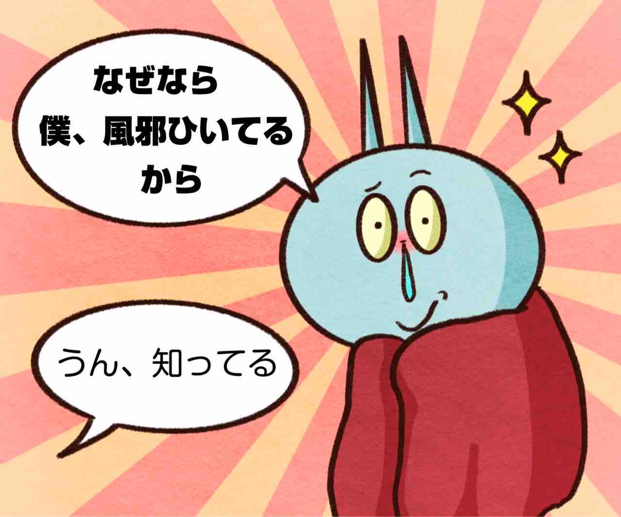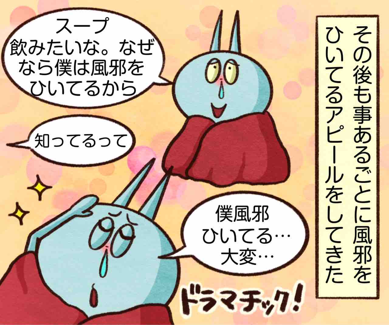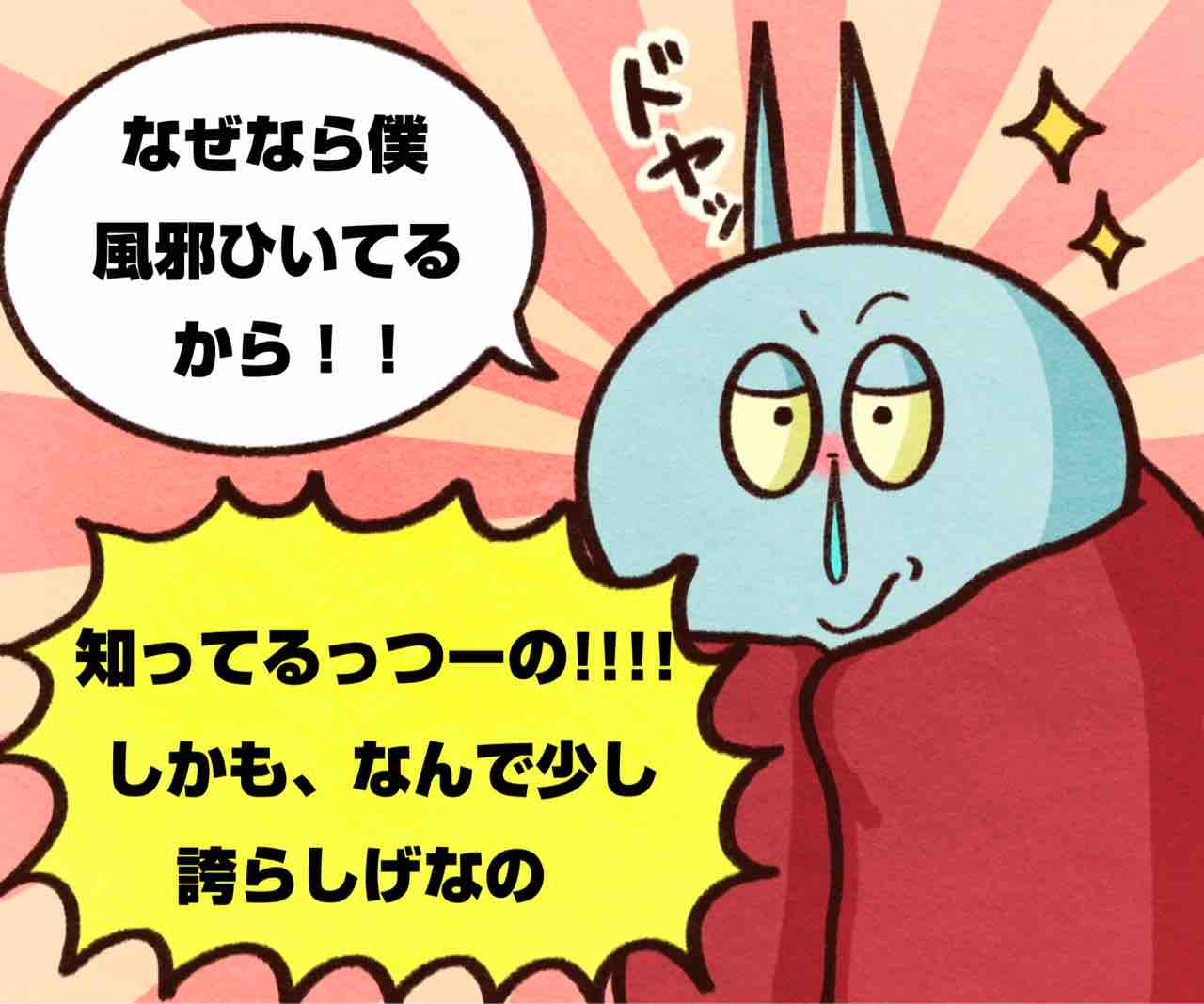 2025年01月18日 風邪ひいてドヤる旦那 ブログネタ:【公式】冬の困りごと に参加中! しつこい!笑いちいち大袈裟なのだが。笑まだこうやってアピールできてる間は元気なほうだぜ。かまちょのLINEスタンプ販売中❤️‼️アプリでフォローしてね‼️ フォローしてくれたら泣いて喜びます クリックして投票してくれたら かまちょも喜びます❤️ 絵日記ランキング にほんブログ村かまちょの写真をアップしたりくだらないことを呟いてるよ🎶ブログには載せていないイラストもアップしてるよ✨