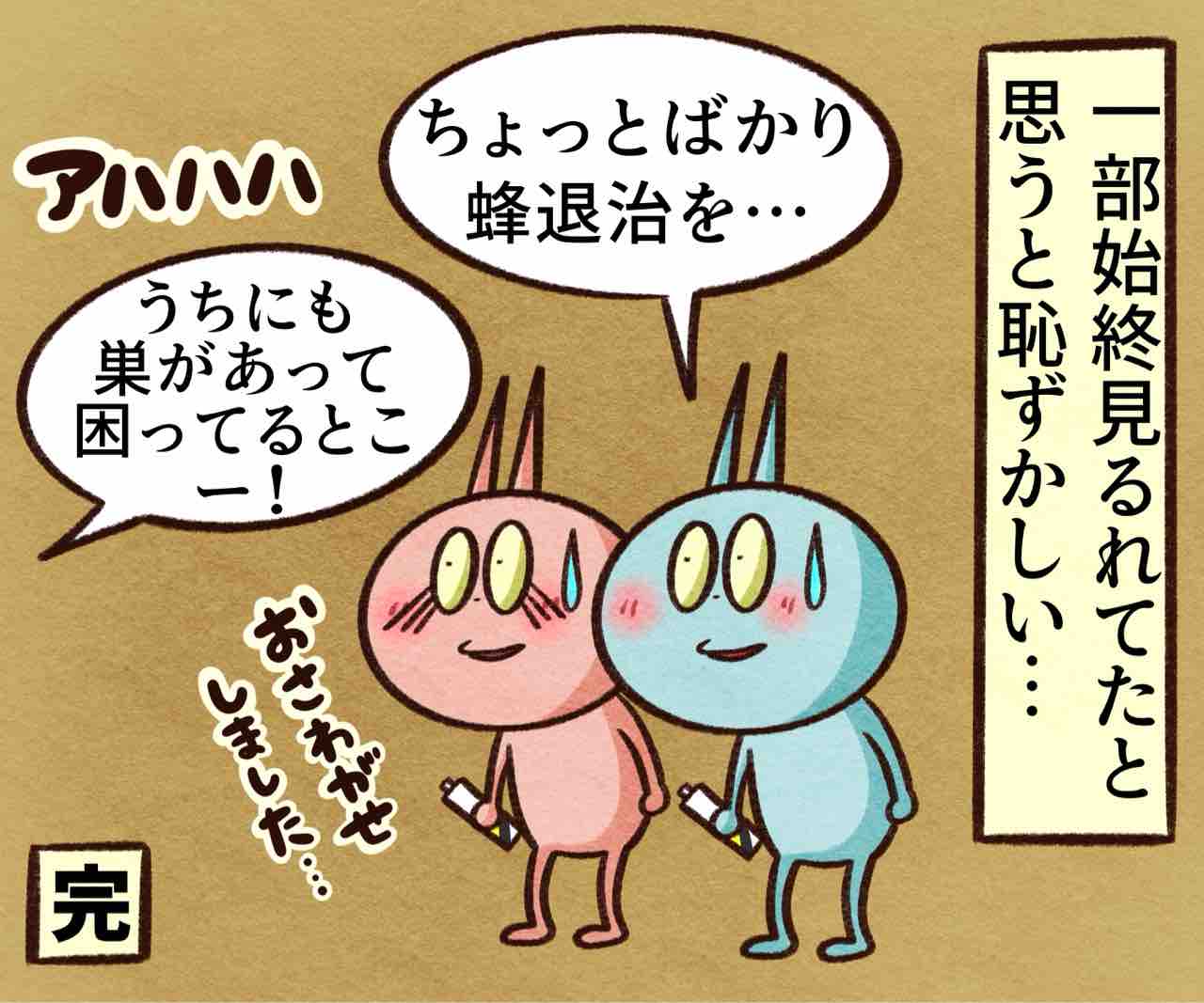 2025年07月19日 蜂へ強制退去命令② ブログネタ:【公式】自分史上"最大のピンチ"は? に参加中! 前回⬇︎ お隣さんがわざわざ心配して様子見に来てくれたよ笑優しい。隣人ガチャ当たり引いた。色々と気にかけてくれて優しい一家。お隣さんのアドバイスでは朝夕のどちらか蜂が巣に戻ってる時にスプレーを噴射したほうが効果があるって教えてくれた。他のとこにも巣作られちゃったから業者呼ぼうかな。蜂に家賃請求したい。かまちょのLINEスタンプ販売中❤️‼️アプリでフォローしてね‼️ フォローしてくれたら泣いて喜びます クリックして投票してくれたら かまちょも喜びます❤️ 絵日記ランキング にほんブログ村かまちょの写真をアップしたりくだらないことを呟いてるよ🎶ブログには載せていないイラストもアップしてるよ✨